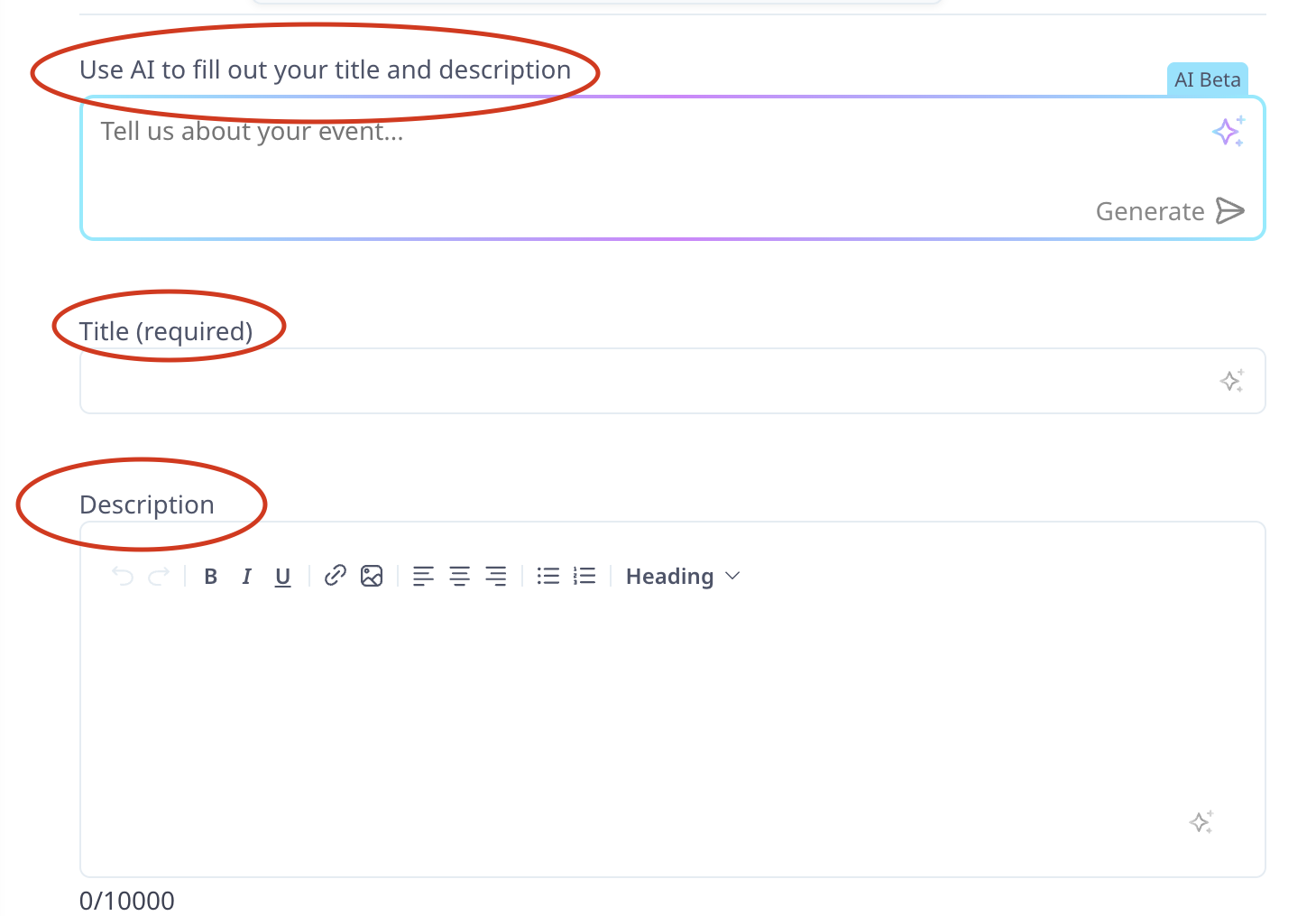 3. You can use AI to generate a title and description, or add them manually. You also have the option to drag and drop images into the description box.