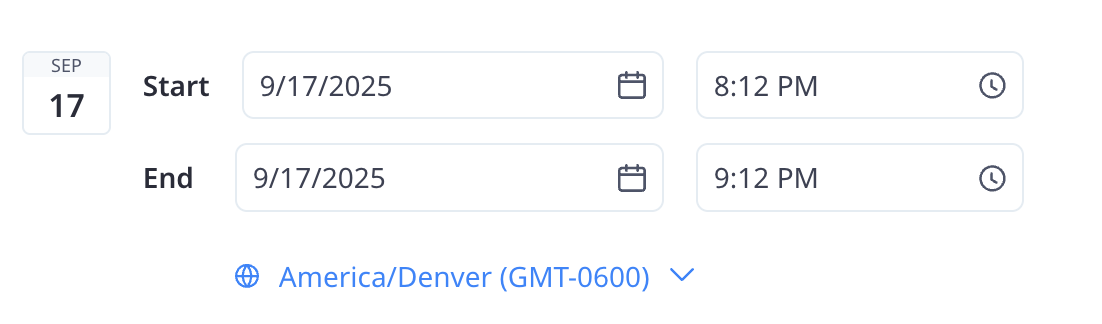 4. Enter the start and end date of your event, including the times for both.
