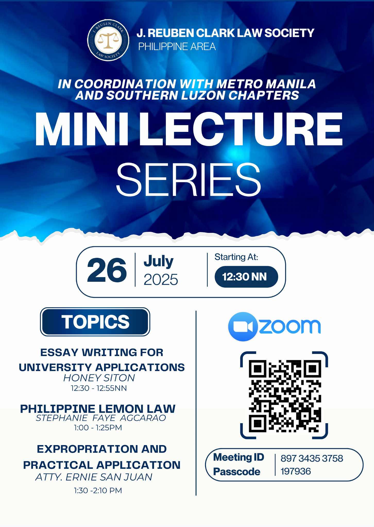 Join to hear 3 JRCLS PHL members speak on Essay Writing for University Applications, the Philippine Lemon law, and Expropriation and Practical Application.